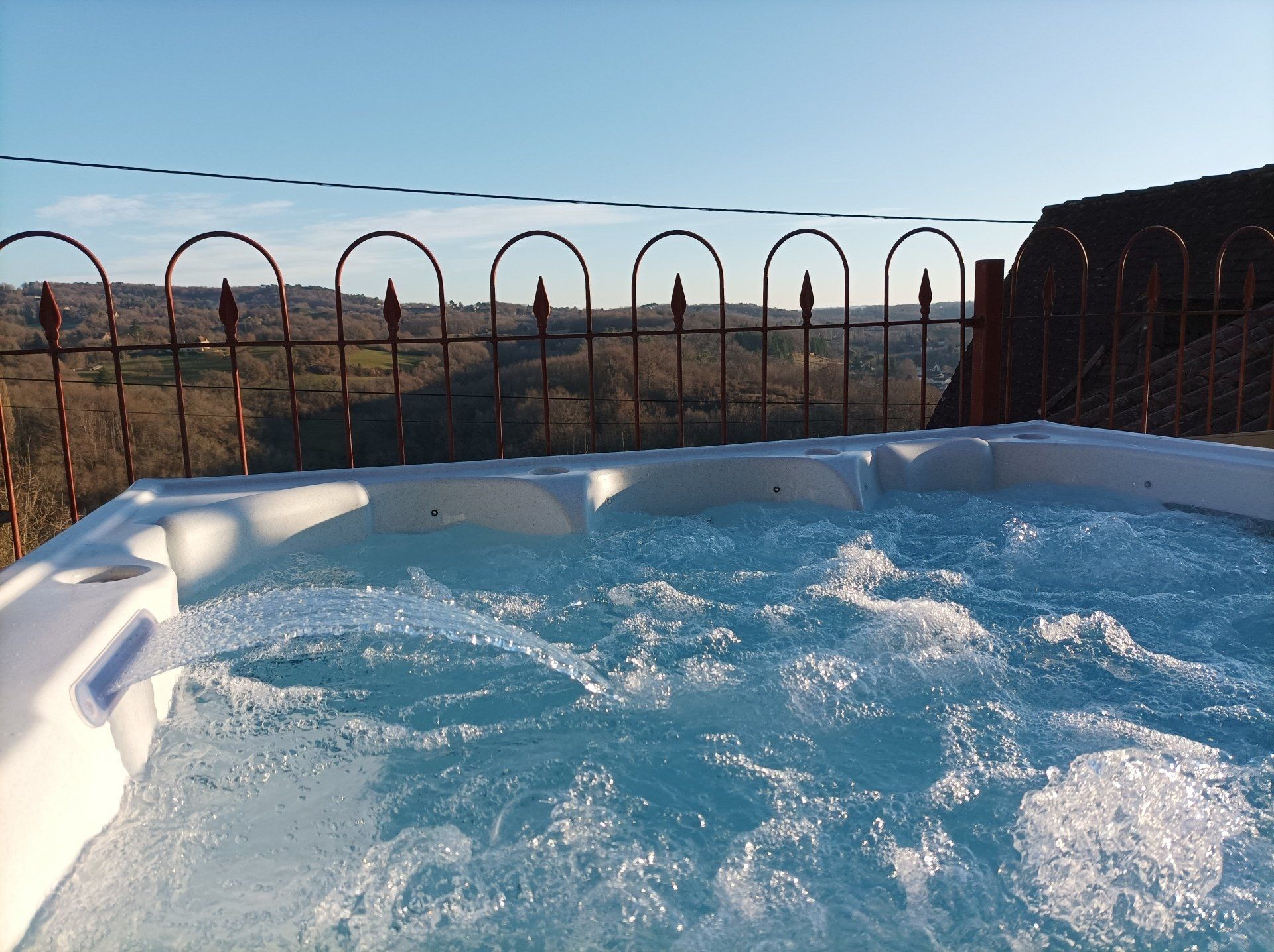 Una terraza equipada con un gran spa privado, con acceso directo desde el dormitorio, ofrece una notable vista panorámica del valle.